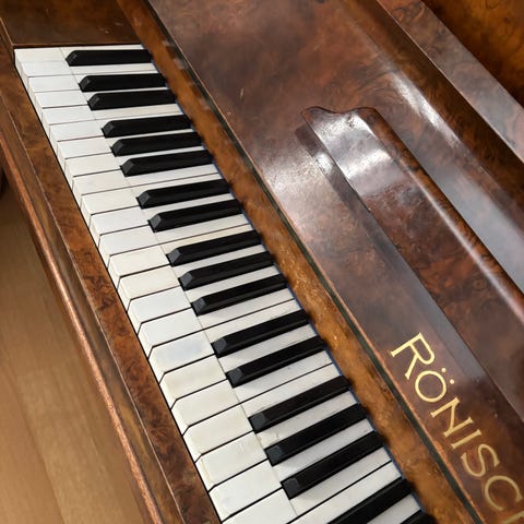 Ukjent merke Upright piano i brun tre. Pianoet har en klassisk design med tre pedaler og en kompakt størrelse som passer til mindre rom.