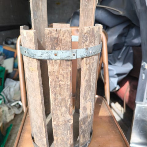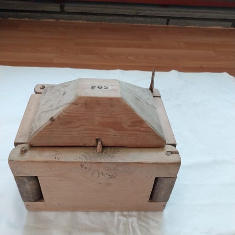 Trekasse lengste høyde 40 cm. Laveste høyde 29 cm. Lengde 20 cm. Bredde 20 cm.