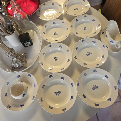 Middag og kaffe servise fra Firkløveren selges. Kaffe servise til 10 personer. Middagservise er 11 middagstallerken og 12 suppe tallerkener. Serveringsfat, boller og sausenebb. Brukt få ganger. Som bytt. Nypris for dette er rundt 30000.