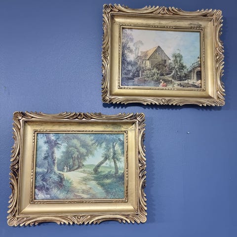 Brodert bilde som viser to barn, med en dekorativ gullfarget ramme. Bildet har detaljerte farger og tekstur, og er utstyrt med oppheng på baksiden for veggmontering.