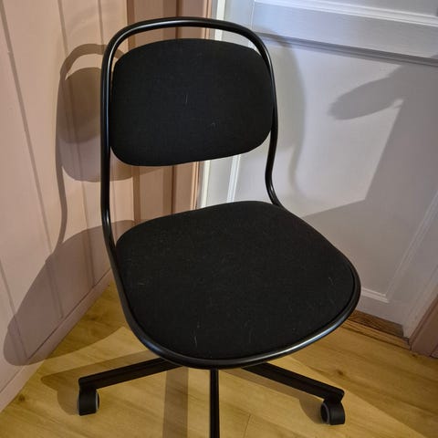 Selger IKEA kontorstol (Gregor) i rotting med ramme i svart metall. Stolen har hvit pute for ekstra komfort og hjul for enkel bevegelse. Behagelig å sitte i. Lett å heve/senke setet.