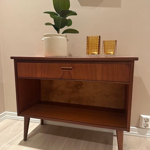 Meget pent liten skjenk i teak selger rimelig. Opprinnelig fra en hylleseksjon som jeg har gjort om til en liten skjenk/ avslastninghylle. Bena er fra samme tidsrom. Ingen skader og minimalt bruksmerker. Ser bilder. Glasshylle. Passer perfekt i gangen og stue.