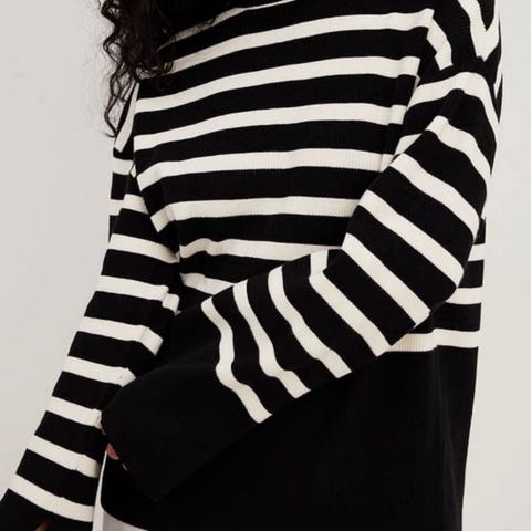 Selger en lekker strikket kroppsnær kjole fra Adoore i str 36. Noe romsligere oventil for byste. Godt hold i strikken i kjolen. Sitter svært flatterende. Brukt ca 5-6 ganger. En og annen nupp på kjolen, men slett ikke fremtredende. Bildene viser den godt frem. God og varm kjole. Ullblanding, se merkelapp. Svart og hvit stripete.