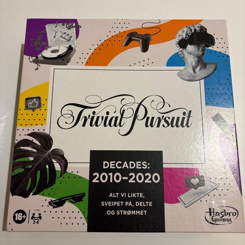Hasbro Trivial Pursuit Decades 2010-2020 brettspill for 2-6 spillere, anbefalt aldersgrense 16+. Inkluderer spørsmål om temaer som nyheter, kultur, internett og underholdning fra perioden 2010 til 2020.