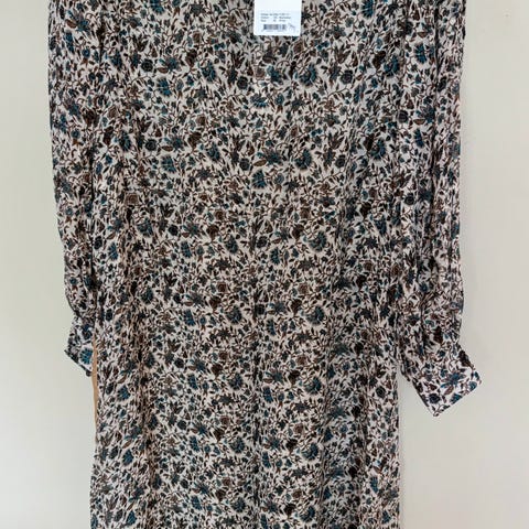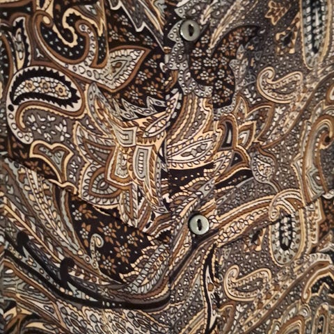 Paisleymønstret kjole i lekker viskose. Kjolen er lang, fra skulder og med er 135 cm. Belte i samme stoff. Knapper hele veien. Den er noe smal i livet, så vil si dette er en liten L , eller stor M. Jeg sender den gjerne til deg.