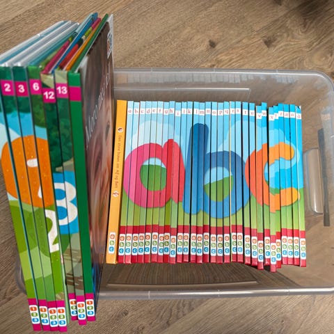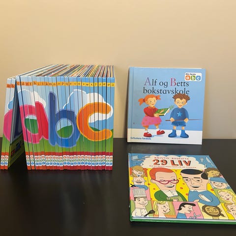 Pakke med A, D, E, G, I, J, K, R, S, V og Z bøkene. 29 morsome bokstavspill, Alf og Bett bokstavspill. Lydbøker: a, d, e, g, h, i, j, k, l, r, s, v og z (noen av disse er litt hakkete.)
