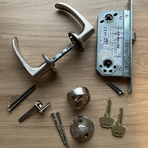 Komplett Maco 4565 låsesett som inkluderer låskasse, håndtak, sylindere og nøkler. Aldri hatt nor problemer med denne! Selges da jeg har gått over til digital lås.