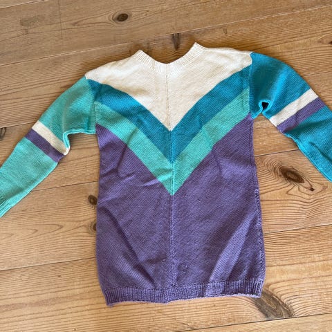 Hjemmestrikket Flerfarget Genser i Bomull. Str. 134 . Som ny. Hel lengde :54 cm. Vidde fra side til side: 44 cm. Armlengde fra festet: 40 cm. Kr. 250.-