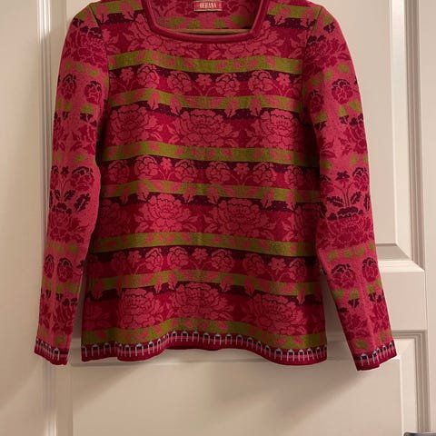 Oleana genser i ull, størrelse L for dame. Genseren er rød med mønsterdetaljer og har en kombinasjon av farger i kantene. Laget av 100% ren ny ull, produsert i Norge.