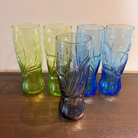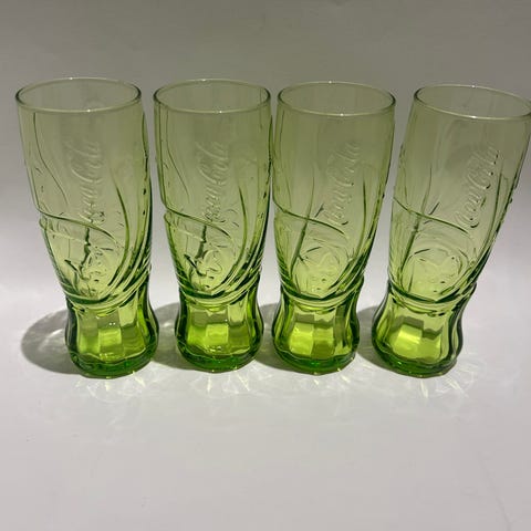 4 Coca-Cola drikkeglass laget av lilla glass. Glassene har et karakteristisk design med Coca-Cola-logo og er egnet for servering av kalde drikker.