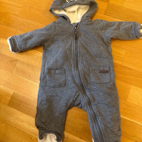 H&M grå unisex baby vinterdress i størrelse 74, laget av bomull. Dressen har hette og glidelås foran, og er foret med mykt materiale for varme og komfort.