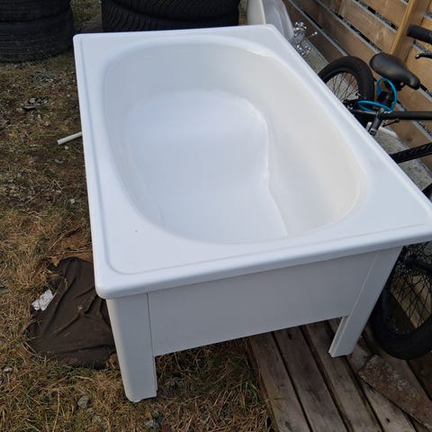 Hjørnebadekar i hvit akryl, designet for plassering i hjørne. Badekaret har avrundede former og integrert overløp og avløp. Egnet for baderom med begrenset plass.