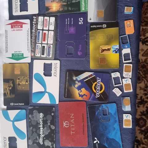 Samling av telefonkort med ulike motiver og design. Kortene varierer i størrelse og farge, og inkluderer flere forskjellige temaer og illustrasjoner. Egnet for samlere eller som referansemateriale for telefonkort.