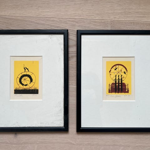 Innframming: Verket er innrammet i en svart ramme med et indre sølv/grått passepartout, klart til å henges opp.