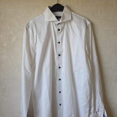 Hvit skjorte m blå innerkant, slimfit. Som ny.