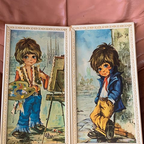 Koselig bilde som blir en fargeklatt på veggen. Er omkring 50 år gammelt. Størrelse: 19,5 cm bredt og 44,5 cm høyt.