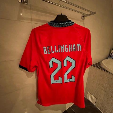 Jeg selger England sin bortedrakt fra VM i 2024 med Mainoo på ryggen.