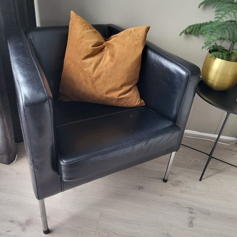 En svart skinnstol med tilhørende fotskaml. Stol og skaml har rund metallbase og er designet for komfort. Passer for bruk i stue eller kontor.
