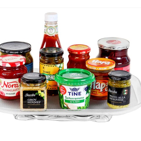 Boxo roterende serveringsbrett laget av klar plast. Brettet har en roterende funksjon som gjør det enkelt å få tilgang til gjenstander plassert på det. Egnet for organisering av krydder, sauser og andre små beholdere i kjøkkenet eller badet