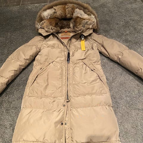 Parajumpers lang blå dunjakke, str. S for kvinner. Jakken er laget av dun, noe som gir god isolasjon og varme.