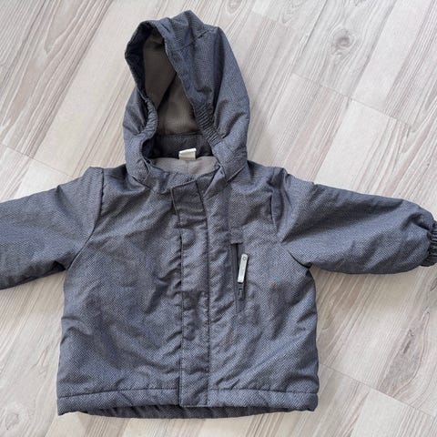 Grå jakke med hvitt for og snøkrystaller- og nissebroderi. Knapper og hette.