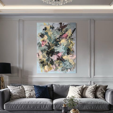 Fargekontrast: Sterk kontrast mellom den mørke, kaotiske bakgrunnen og de lyse, neon-lignende aksentfargene (rosa, lyseblått, gull).