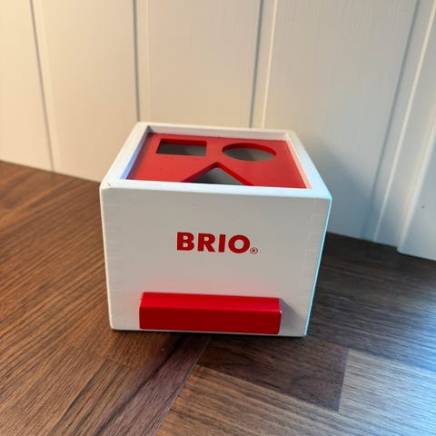 BRIO Lekeboks i tre med former i rosa farge. Inkluderer flere former som passer i tilsvarende hull på boksen. Egnet for små barn for å lære former og utvikle motoriske ferdigheter.