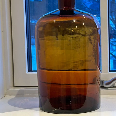Gammel antikk glassflaske i brun med lokk i glass. Utrolig fin bare som den er eller man kan bruke den som vase å ha både strå eller blomster i den.