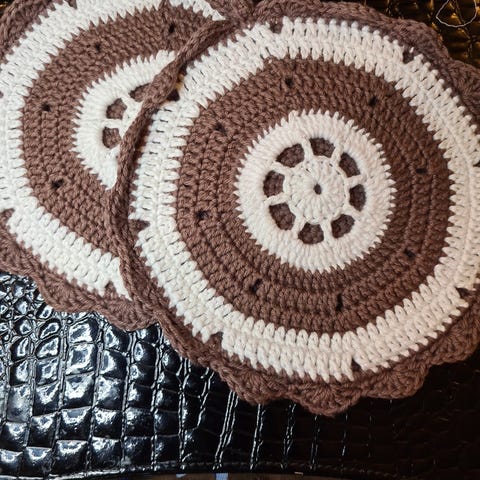 Strikka, doble grytekluter av 100% bomull selges for kr. 180. De er ca 24 x 24 cm, og siden de er strikka rundt, er de tykke og gode. Akkurat slik JEG vil ha gryteklutene!