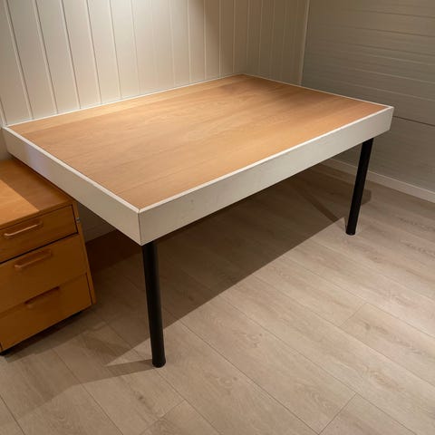 Selger et langt og praktisk bord i svart. Bordet står stødig med fem ben og passer perfekt som arbeidsbord, skrivebord, hobbybord eller avlastningsbord. Overflaten har noen bruksmerker, men er ellers i grei stand og fullt funksjonelt.