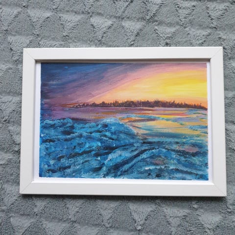 T.M. maleri av landskap utført i olje på lerret. Bildet viser en solnedgang over havet med båt og refleksjoner i vannet. Inkluderer ramme i lys farge. Egnet som dekorativ kunst. Tatiana Mortensen, signert.