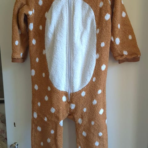 Supermyk og varm reinsdyr-onepiece med hette, gevir og søtt Rudolf-ansikt. Perfekt til jul, barnehage, nissefest eller som kosedress hjemme.