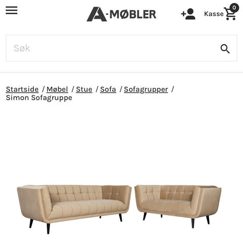 Simon Henningsen sofa sett i beige stoff. Settet inkluderer to sofaer med tuftet design og polstret sete og rygg. Sofaene har en moderne stil med rette armlener og ben i mørk finish. Passer for stue eller oppholdsrom. Selger en flott velursofagruppe kjøpt fra A-Møbler for 1 år siden. Består av 3-seter 228 × 90 × 76 cm (sittehøyde 44 cm) og 2-seter 168 × 90 × 76 cm (sittehøyde 44 cm). Begge sofaene er lite brukt, godt tatt vare på og ser nesten nye ut. Myk og behagelig velour i fargen beige, med sorte treben. Selges pga ommøblering. Røykfritt og dyrefritt hjem. Selges pga. ommøblering.