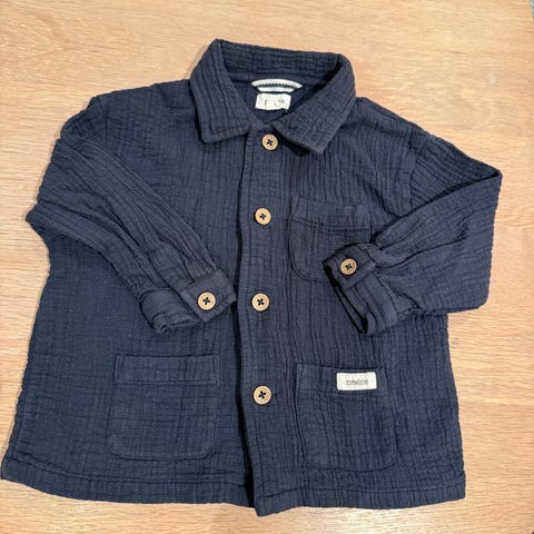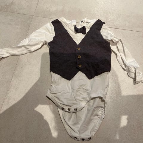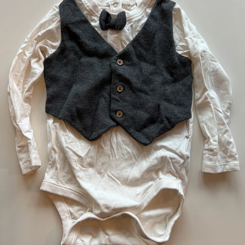 Newbie og KappAhl genser og skjorte for gutt i størrelse 86. Sett bestående av en rød genser i bomull med knappedetaljer på skulderen, og en hvit langermet body med knappelukking foran. Materialet er bomull.