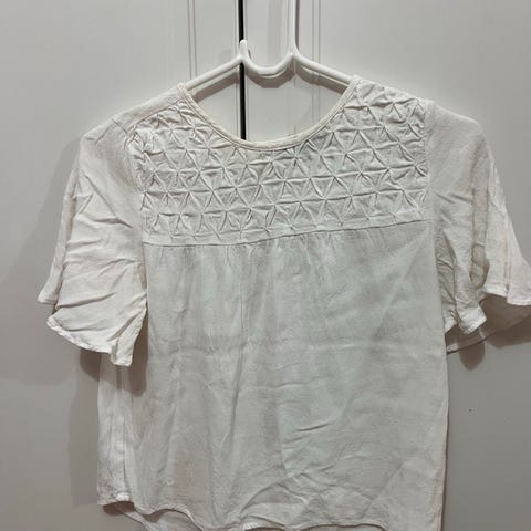 Hvit bluse / t-skjorte / topp. Sommerlig. Behagelig på. Puffermer. Litt trang til meg over armene.