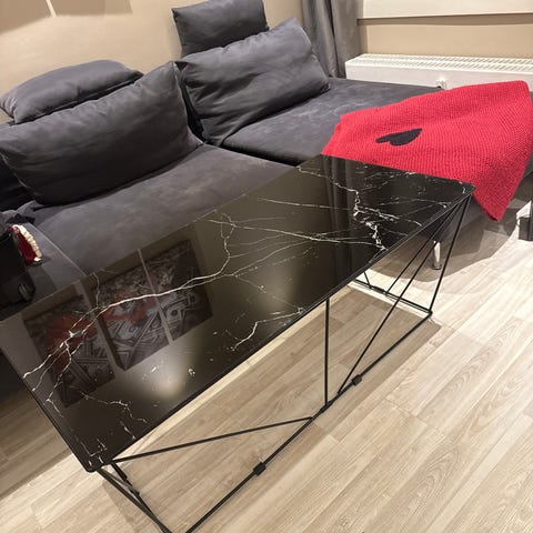 Salongbord i glass, "marmoren" er kontaktfolie.