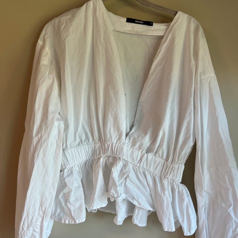 Bik Bok bluse i hvit farge, størrelse M. Blusen har lange ermer, knappestolpe foran og to brystlommer. Passer til kvinner.