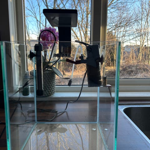 Akvarium med svart lokk og integrert LED-lys. Glasskonstruksjon med tilkoblingskabel for belysning. Egnet for oppdrett av akvariefisk og dekorative vannplanter.