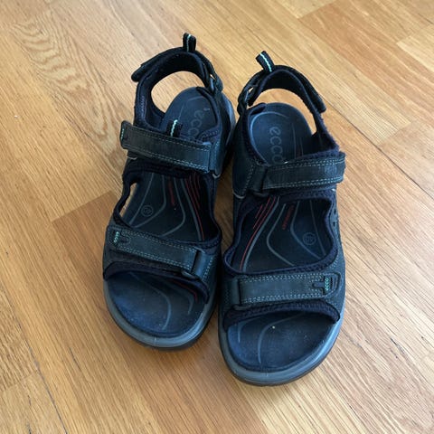 Lette og støttende Ecco Offroad sandaler i str. 40 selges for 550 kr + eventuelt frakt. Lite brukt, brukt kun på stranden og på sommeren, så noe misfarging på sålen inni. Sandalene fra Ecco er kjent for å gi en overlegen gåkomfort. De har god demping og siden de kan tilpasses både over foten og bak ved ankelen så er de også veldig stabile. God såle med godt grep. Farge: Brunsvart