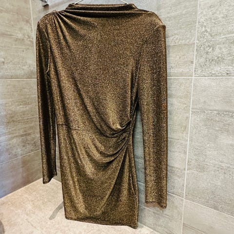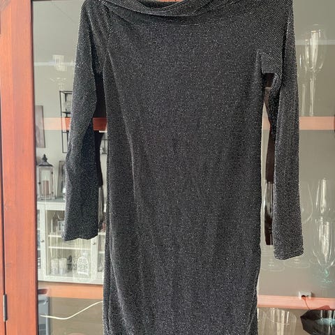 Sit fint på. Kan brette ned i halsen så den blir off shoulder. Blåfarge med glitter. Brukt ein gong ifjor på julafta.