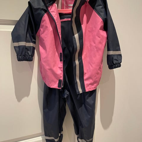 Gummistrikken på beina er hele og fine. Regnbuksen har litt slitasje, se bilde. Regnjakken med stjerner på har noe slitasje rundt ene håndleddet og i stoffet på fronten, se bilde :)
