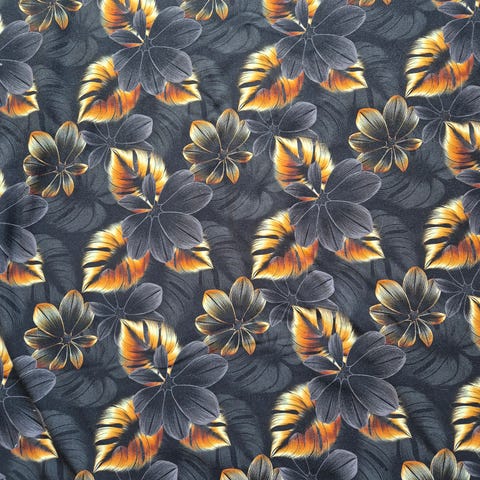 Jersey stoff med blomstermønster i svart bakgrunn med oransje, hvite og gule blomster og grønne blader. Stoff str. er 2,6m*1,5m