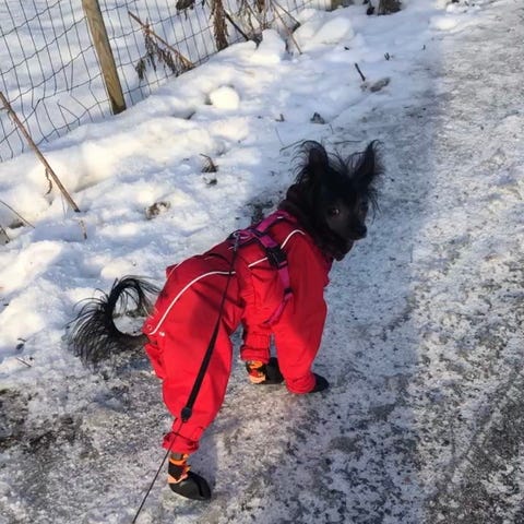 Denne dressen er meget pent brukt et par ganger det første året, og min whippet har vokst fra den! Han veier 17,5 kilo nå så denne dressen passer til en litt lettere whippet gutt!