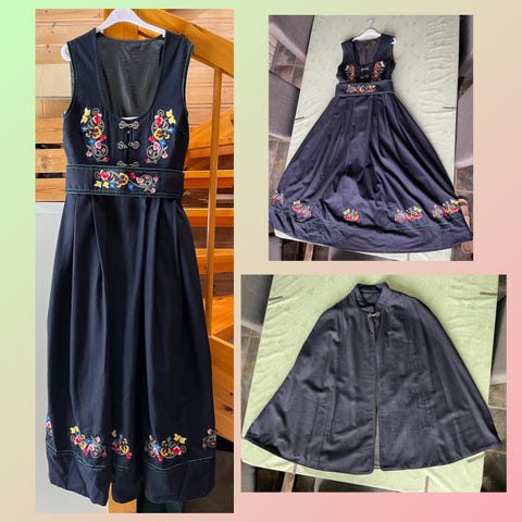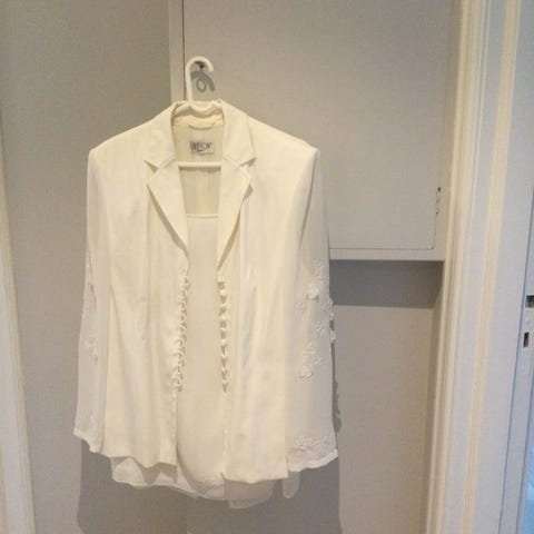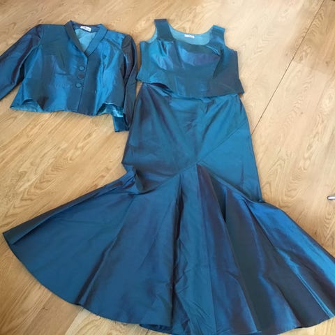 Lys blå polyester dame drakt i størrelse M bestående av jakke med trekvart ermer og blanke knapper.Skjørt med sleng og med glidelås bak. Fargen kommer ikke til sin rett på bildet. Passer til bryllup, formelle og festlige anledninger. Merket er Swing. Frakt kr 76.- kommer i tillegg.