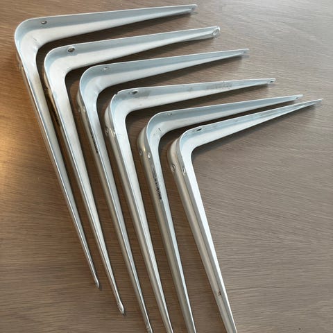 Knekter for montering av hyller. Design som klemmer fast på hylleplaten. Strammes enkelt med skruen på undersiden.