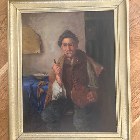Signatur sees i nedre hjørne."Mylarguten" skrevet på baksiden. 58 x 68 cm inkl ramme. Stødig ramme og feste.
