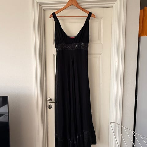 Vila festkjole i størrelse M, farge svart, Kjolen har tynne stropper og belte i midjen i glanset materiale.