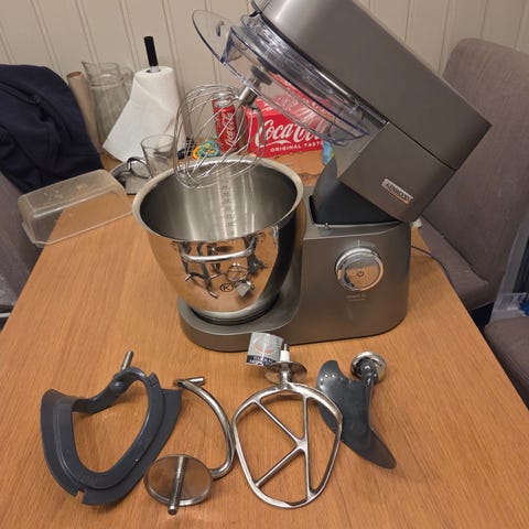 Kenwood kjøkkenmaskin med flere tilbehør, inkludert visper, deigkroker, og annet utstyr. Maskinen er hvit og har en stor bolle for miksing og baking. Egnet for ulike matlagingsoppgaver som elting, visping og blanding.