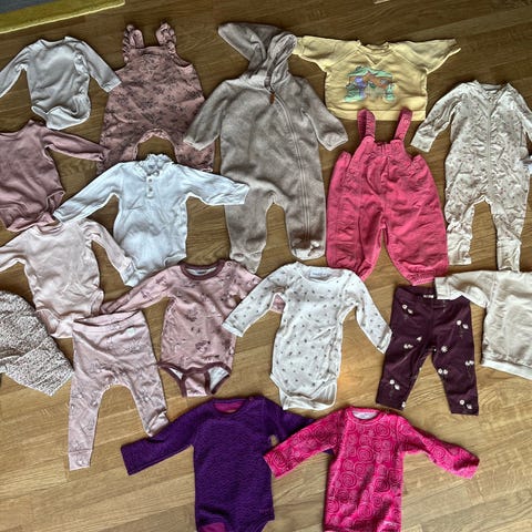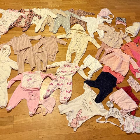 Stor pakke med barneklær for jente i størrelse 56. Inneholder ulike plagg som heldresser, bukser, bodyer, pysjamaser, strømpebukser, kjoler, luer og annet i forskjellige farger og materialer, både bomull, ull og bambus-viskose. Noen klær fremstår nesten nye og veldig lite brukt, og noen er litt loete og godt brukt men har mye bruk igjen ❤️