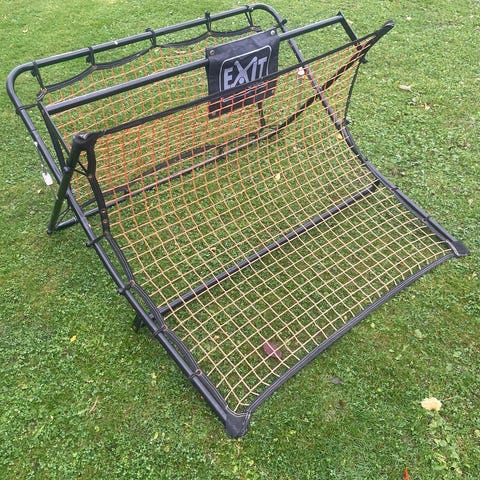 Rød Rebounder med ramme i metall og nett for ballspill. Egnet for innendørs bruk, stabil konstruksjon med sammenleggbar ramme for enkel oppbevaring og transport. Mål: 99x102 cm